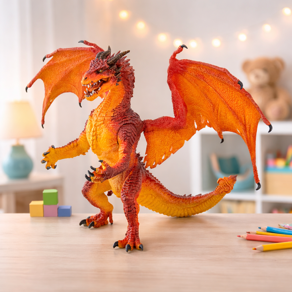 Avec ses ailes flamboyantes, ses écailles d’un rouge incandescent et son regard intense, cette figurine imposante incarne toute la force et la majesté des créatures mythiques.